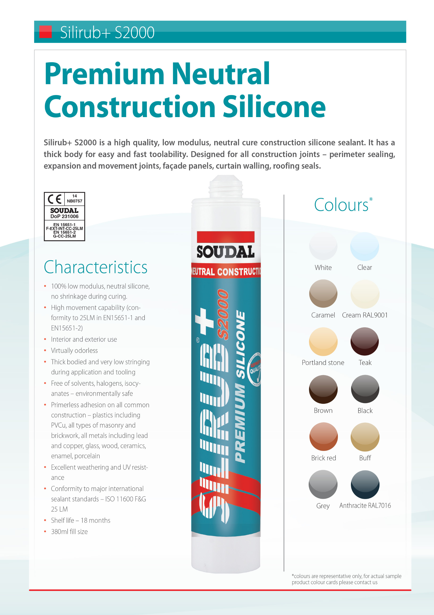 • Silirub+ S2000 is a high quality, 100% neutral curing construction silicone sealant.